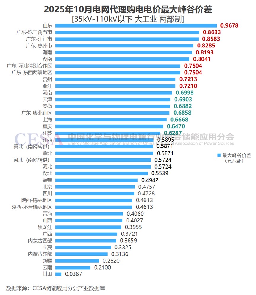 針對(duì)大工業(yè)兩部制35kV-110kV以下(不含1.5倍電價(jià))電網(wǎng)代理購(gòu)電價(jià)格分析顯示,2025年10月共有17個(gè)地區(qū)最大峰谷價(jià)差超過(guò)0.6元/kWh,6個(gè)地區(qū)超過(guò)0.8元/kWh。其中,山東以0.9678元/kWh的價(jià)差位列全國(guó)第一,環(huán)比9月增長(zhǎng)13.33%。此外,廣東部分地區(qū)、海南和湖南的最大峰谷價(jià)差也均超過(guò)0.8元/kWh。