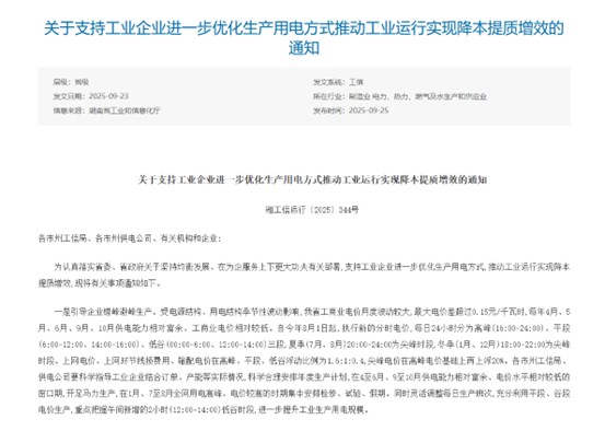 9月24日,湖南省工業(yè)和信息化廳發(fā)布《關(guān)于支持工業(yè)企業(yè)進(jìn)一步優(yōu)化生產(chǎn)用電方式推動(dòng)工業(yè)運(yùn)行實(shí)現(xiàn)降本提質(zhì)增效的通知》。文件明確,自今年8月1日起,執(zhí)行新的分時(shí)電價(jià),每日24小時(shí)分為高峰(16:00-24:00)、平段(6:00-12:00、14:00-16:00)、低谷(00:00-6:00、12:00-14:00)三段,夏季(7月、8月)20:00-24:00為尖峰時(shí)段,冬季(1月、12月)18:00-22:00為尖峰時(shí)段。上網(wǎng)電價(jià)、上網(wǎng)環(huán)節(jié)線損費(fèi)用、輸配電價(jià)在高峰、平段、低谷浮動(dòng)比例為1.6:1:0.4,尖峰電價(jià)在高峰電價(jià)基礎(chǔ)上再上浮20%。各市州工信局、供電公司要科學(xué)指導(dǎo)工業(yè)企業(yè)結(jié)合訂單、產(chǎn)能等實(shí)際情況,科學(xué)合理安排年度生產(chǎn)計(jì)劃,在4至6月、9至10月供電能力相對(duì)富余、電價(jià)水平相對(duì)較低的窗口期,開(kāi)足馬力生產(chǎn),在1月、7至8月全網(wǎng)用電高峰、電價(jià)較高的時(shí)期集中安排檢修、試驗(yàn)、假期。同時(shí)靈活調(diào)整每日生產(chǎn)班次,充分利用平段、谷段電價(jià)生產(chǎn),重點(diǎn)把握午間新增的2小時(shí)(12:00-14:00)低谷時(shí)段,進(jìn)一步提升工業(yè)生產(chǎn)用電規(guī)模。