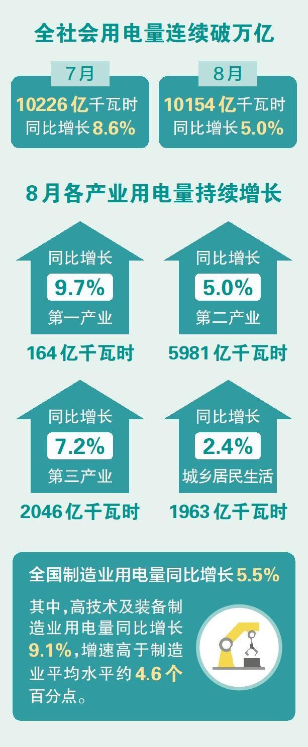 近日,8月全社會(huì)用電量等數(shù)據(jù)出爐。10154億千瓦時(shí),同比增長5.0%——繼7月全社會(huì)用電量達(dá)10226億千瓦時(shí),創(chuàng)下全球紀(jì)錄之后,8月全社會(huì)用電量再次突破萬億千瓦時(shí)。我國單月全社會(huì)用電量連破萬億千瓦時(shí),受到社會(huì)廣泛關(guān)注。