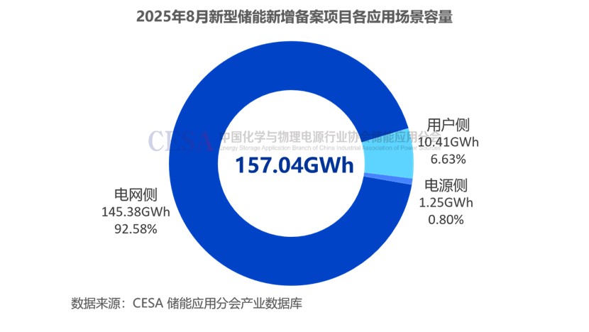 2025年8月,國(guó)內(nèi)電網(wǎng)側(cè)儲(chǔ)能新增299個(gè)備案項(xiàng)目,總規(guī)模達(dá)56.86GW/145.38GWh,占比91.44%(功率)/92.58%(容量),已披露計(jì)劃投資金額達(dá)947億元。