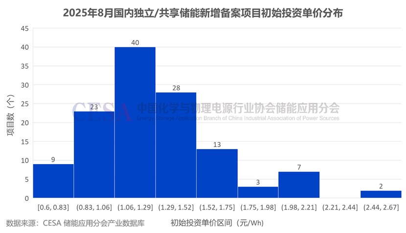 據(jù)CESA儲(chǔ)能應(yīng)用分會(huì)產(chǎn)業(yè)數(shù)據(jù)庫(kù)不完全統(tǒng)計(jì),2025年8月,國(guó)內(nèi)新增鋰電池獨(dú)立/共享儲(chǔ)能項(xiàng)目中,125個(gè)項(xiàng)目公布了有效初始投資單價(jià)(注:此處統(tǒng)計(jì)已去除無(wú)效報(bào)價(jià)),主要集中在0.6-2.55元/Wh,平均初始投資單價(jià)1.3095元/Wh。