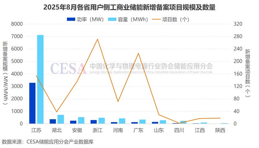 2025年8月,國(guó)內(nèi)共新增備案29個(gè)百兆瓦時(shí)級(jí)的用戶側(cè)工商業(yè)儲(chǔ)能項(xiàng)目,其中28個(gè)為獨(dú)立配置的工商業(yè)儲(chǔ)能項(xiàng)目,1個(gè)為儲(chǔ)充項(xiàng)目。江蘇獨(dú)占鰲頭,達(dá)20個(gè),安徽、河南、山東、湖北各2個(gè),四川1個(gè)。
