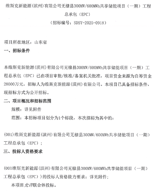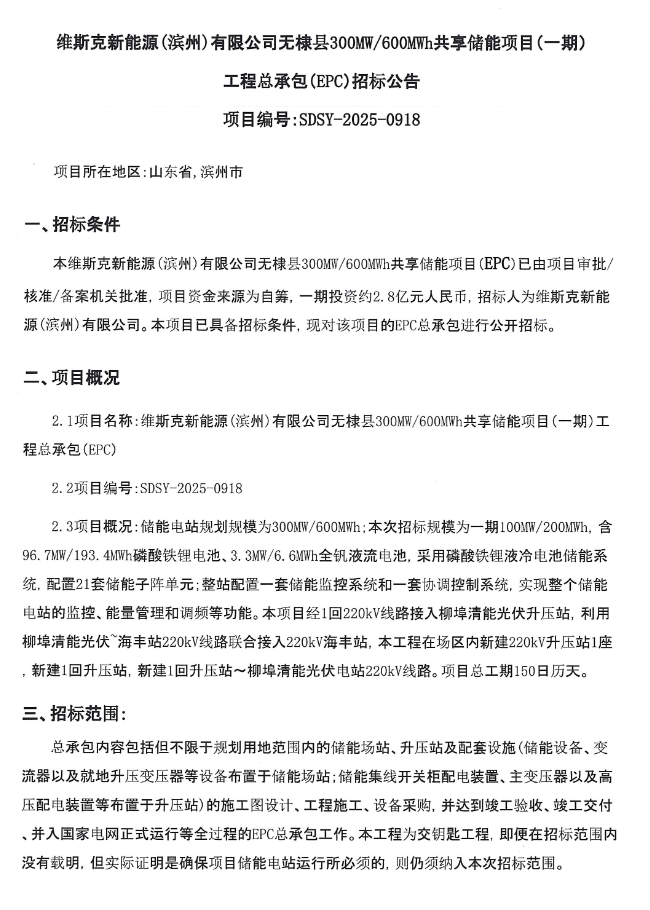 中國儲能網(wǎng)訊:9月3日,維斯克新能源(濱州)有限公司山東無棣縣300MW/600MWh共享儲能項(xiàng)目(一期)EPC招標(biāo)發(fā)布,項(xiàng)目資金來源為自籌資金28000萬元,折合單價(jià)約0.47元/Wh。招標(biāo)人為維斯克新能源(濱州)有限公司,是中能綠投(山東)新能源產(chǎn)業(yè)有限責(zé)任公司旗下子公司。