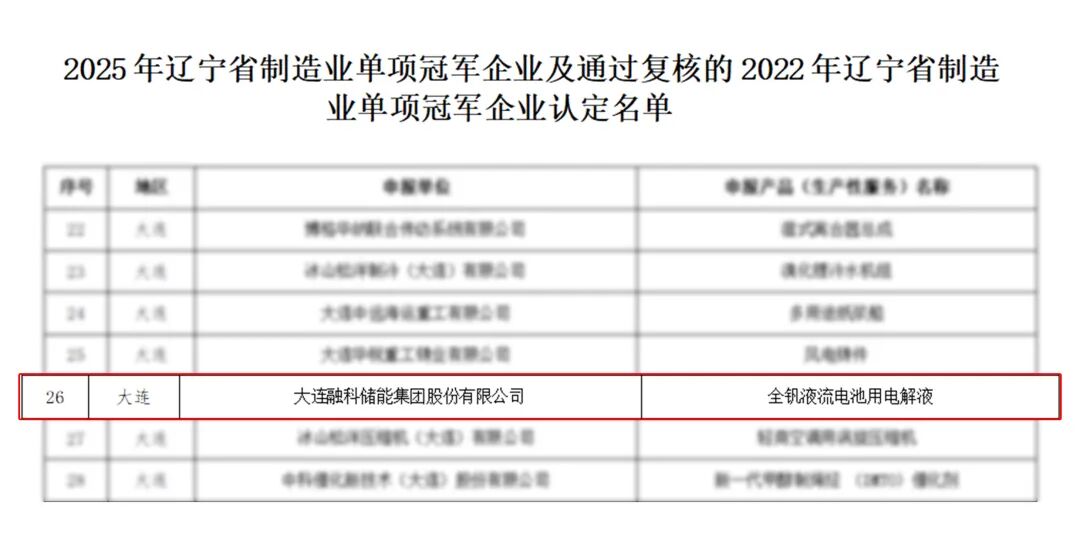 中國儲能網(wǎng)訊:近日,遼寧省工業(yè)和信息化廳公示了2025年遼寧省制造業(yè)單項(xiàng)冠軍企業(yè)及通過復(fù)核的2022年遼寧省制造業(yè)單項(xiàng)冠軍企業(yè)認(rèn)定名單,大連融科儲能集團(tuán)股份有限公司(以下簡稱“融科儲能”)憑借釩液流電池用電解液方面的卓越表現(xiàn),成功入選2025年遼寧省制造業(yè)單項(xiàng)冠軍企業(yè)名單,這一榮譽(yù)標(biāo)志著融科儲能在釩液流電池用電解液領(lǐng)域的卓越實(shí)力,以及在制造業(yè)細(xì)分領(lǐng)域的領(lǐng)先地位。