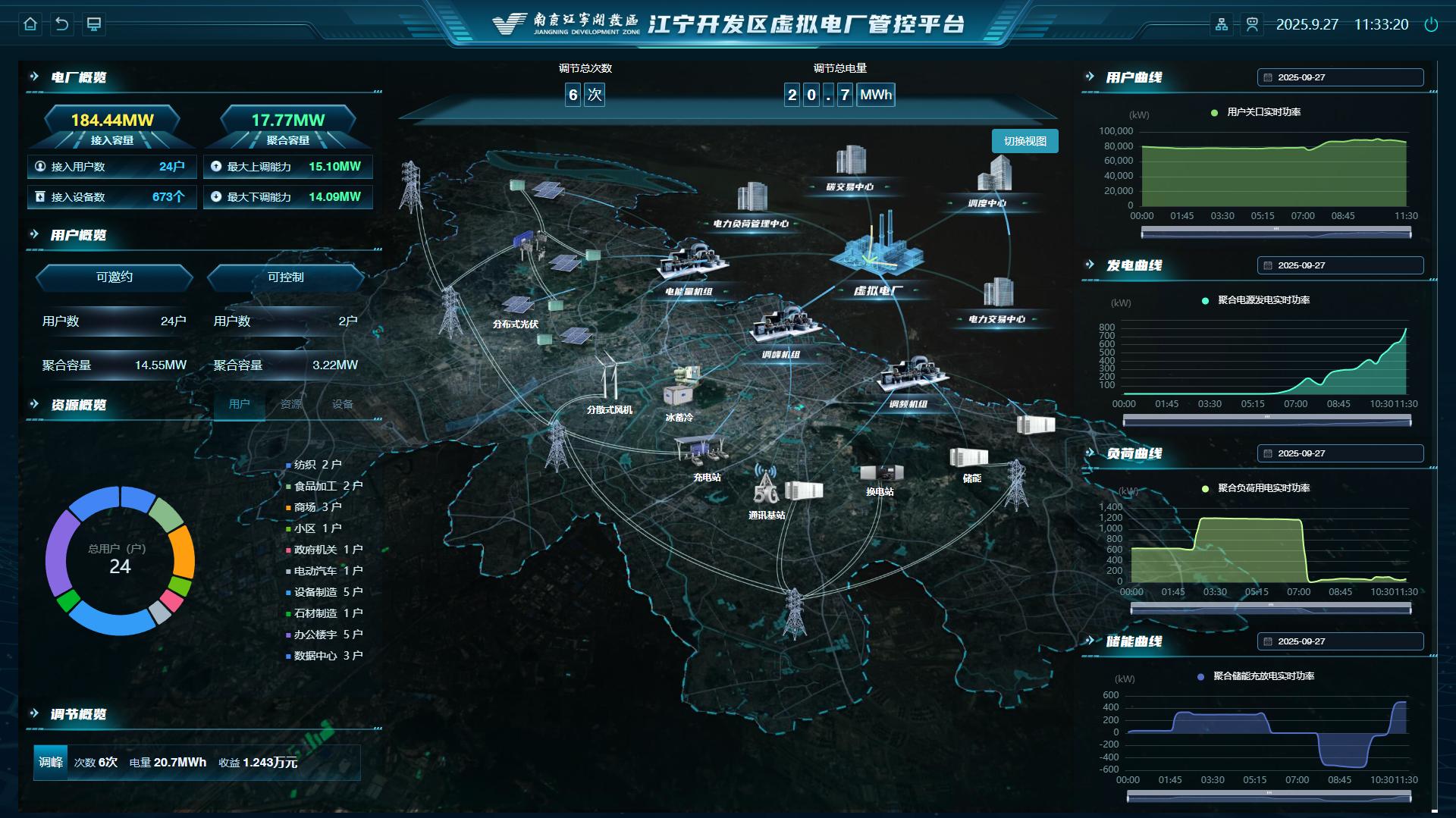 該公司的成立,標志著三方合作的項目“江寧開發(fā)區(qū)能碳虛擬電廠示范項目”正式邁入實體化市場運營新階段。項目綜合運用發(fā)電預測、負荷預測、價格預測、可調(diào)潛力分析、資源聚合、優(yōu)化調(diào)度、協(xié)調(diào)控制及交易輔助決策等核心技術(shù),聚合區(qū)內(nèi)分布式光伏、儲能、充電樁、空調(diào)負荷、冰蓄冷、電鍋爐、工業(yè)可調(diào)負荷等多元化靈活性資源,常態(tài)化參與需求響應、電力輔助服務及電力現(xiàn)貨等市場化交易,為用戶提供智能化、集約化的智慧用能服務。項目創(chuàng)新性提出“電碳耦合”與“配微協(xié)同”技術(shù),構(gòu)建區(qū)域多層協(xié)同的智慧能碳管控平臺,服務政府、園區(qū)及企業(yè)建立覆蓋全生命周期、全環(huán)節(jié)、全鏈條的智慧能碳管理系統(tǒng),實現(xiàn)碳足跡精準追溯,降低用能成本,有效提升能源綜合利用效率,推動區(qū)域碳排放強度持續(xù)降低。項目已接入各類用戶側(cè)資源規(guī)模達200兆瓦,并于2025年4月成功入選國家發(fā)展改革委全國第二批綠色低碳先進技術(shù)示范項目清單,成為國家級綠色低碳示范標桿。