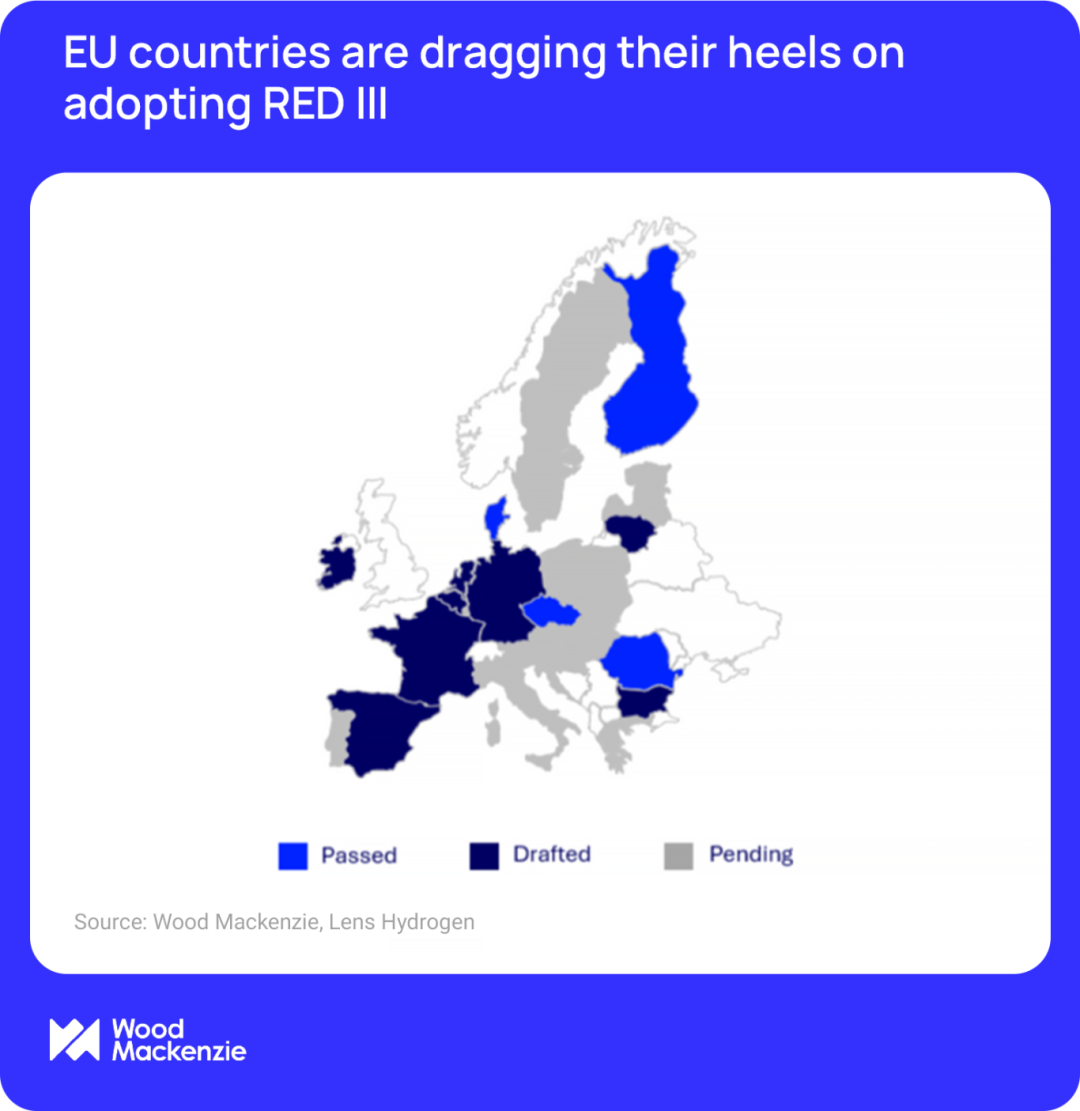 將RED III相關(guān)要求轉(zhuǎn)化為各成員國國內(nèi)法律的進展遲緩,這對投資決策造成阻礙,削弱了市場信心。由于各成員國缺乏明確的國內(nèi)法規(guī),項目開發(fā)商無法評估業(yè)務(wù)的可行性,也無法獲取融資,更難以開展跨境合作項目。