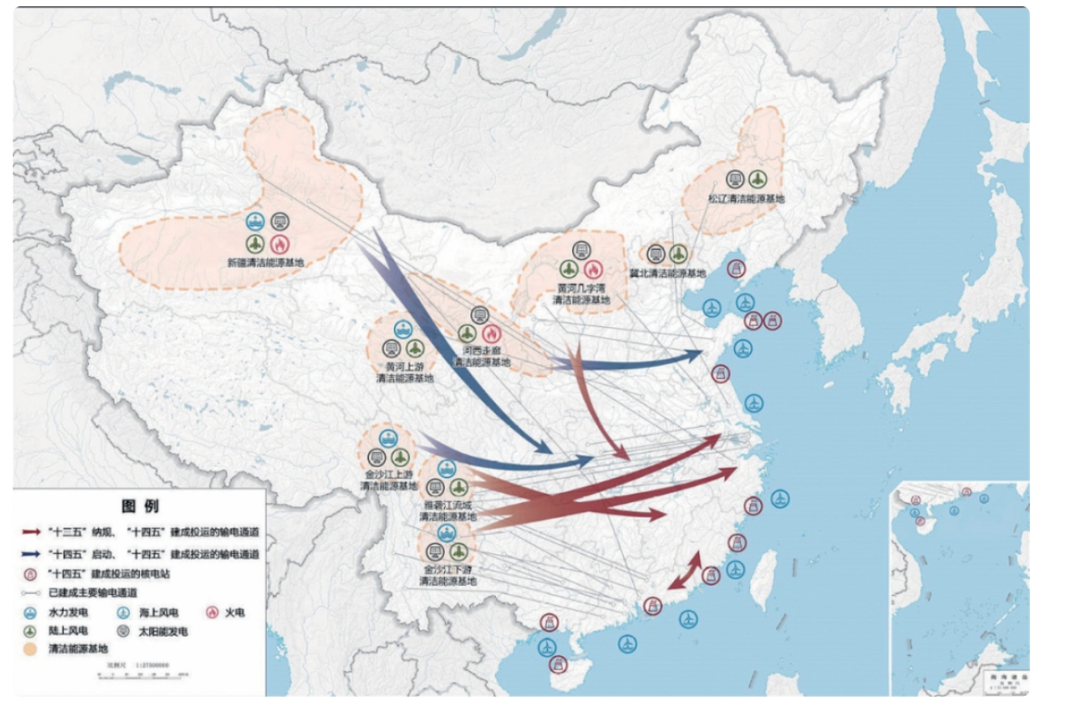 根據(jù)“十四五”規(guī)劃《綱要》,我國(guó)在示意圖中畫出9座大型清潔能源基地,分別為松遼、冀北、黃河幾字彎、河西走廊、黃河上游、新疆、金沙江上游、雅礱江流域和金沙江下游清潔能源基地。此外,還有5個(gè)海上風(fēng)電基地,分別為廣東、福建、浙江、江蘇、山東等海上風(fēng)電基地。