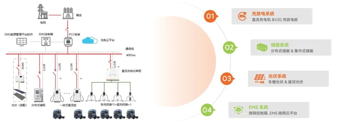 重卡充電站自身用電量大,電費(fèi)成本極高??赏ㄟ^配置儲(chǔ)能系統(tǒng),實(shí)現(xiàn)谷充峰放策略,降低用電成本,提升運(yùn)營(yíng)收益。也可以通過將單一的充電站轉(zhuǎn)換為綜合能源站,利用太陽能發(fā)電技術(shù),進(jìn)一步降低用電成本。未來還支持?jǐn)U展V2G與分布式儲(chǔ)能、光伏系統(tǒng),實(shí)現(xiàn)光儲(chǔ)充放一體化,打造能源交互融合發(fā)展。