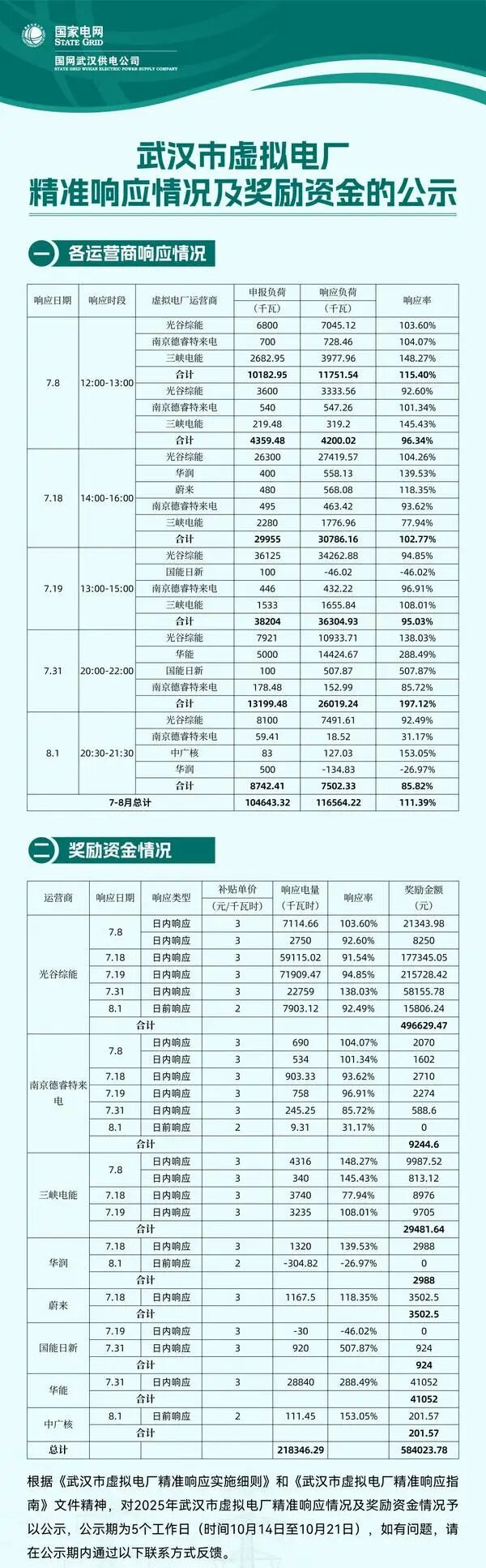 從獎勵資金情況來看,7-8月光谷綜能、南京德睿特來電、三峽電能、華潤、蔚來、國能日新、華能、中廣核總共8家虛擬電廠運(yùn)營商合計(jì)響應(yīng)電量218.35MWh,獲得獎勵金額58.4萬元。