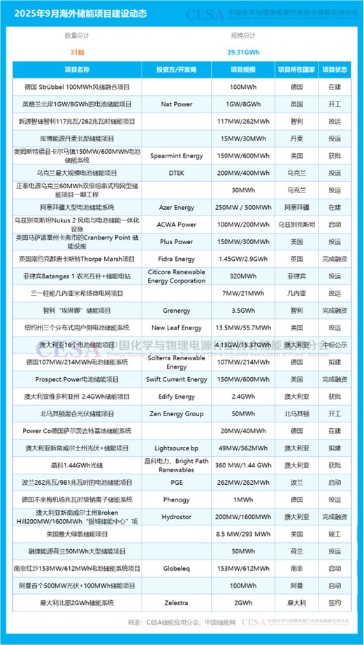 中國(guó)儲(chǔ)能網(wǎng)訊:2025年9月,CESA儲(chǔ)能應(yīng)用分會(huì)產(chǎn)業(yè)數(shù)據(jù)庫(kù)追蹤到31起海外儲(chǔ)能項(xiàng)目建設(shè)動(dòng)態(tài)事件,總規(guī)模為39.31GWh,涉及Nat Power、Spearmint Energy、DTEK、Azer Energy、ACWA Power、Plus Power、Fidra Energy、Grenergy、New Leaf Energy、PGE、Phenogy、Hydrostor、Globeleq、Zelestra等全球能源投資方/開(kāi)發(fā)商,建設(shè)地點(diǎn)位于澳大利亞、美國(guó)、德國(guó)、烏克蘭、英國(guó)、智利、阿曼、阿塞拜疆、北馬其頓、波蘭、丹麥等國(guó)家。