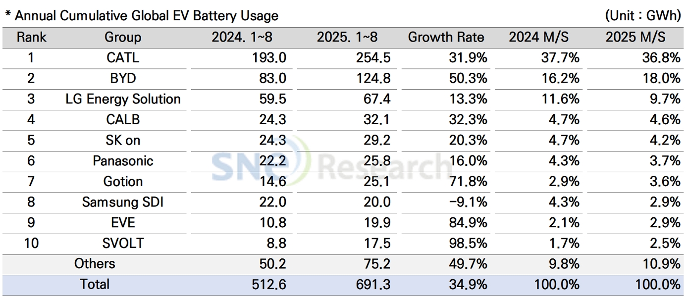 2025年1-8月全球動(dòng)力電池企業(yè)裝機(jī)量 圖片來源:SNE Research