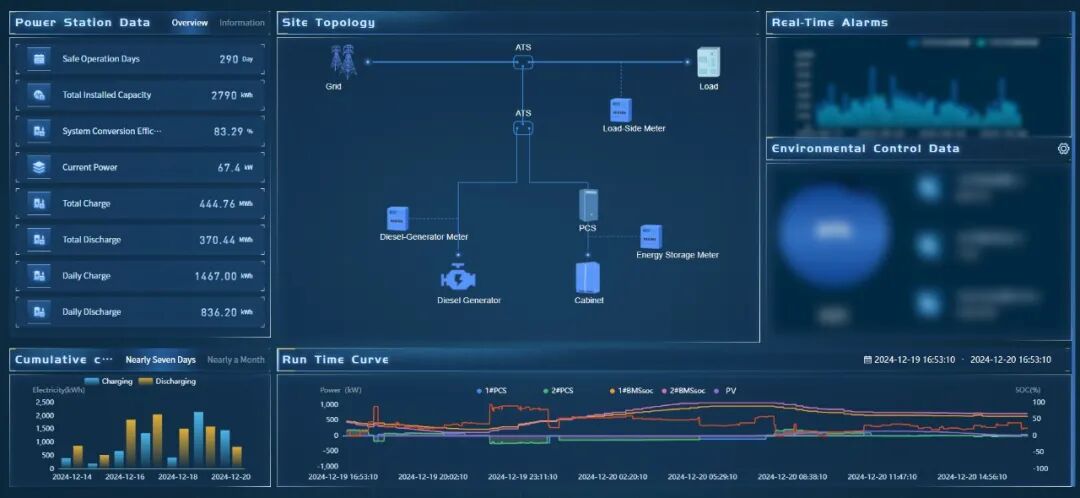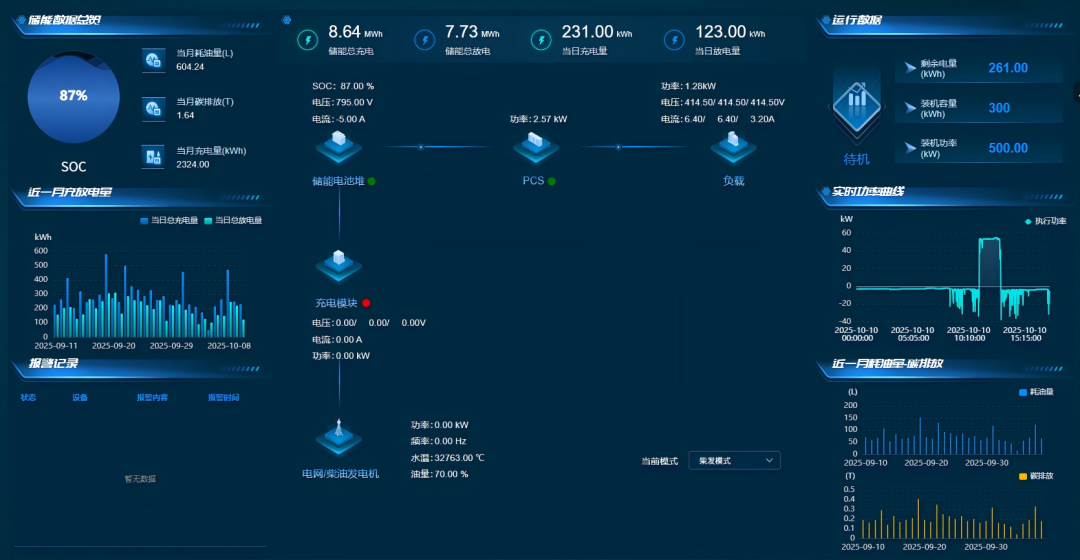 建筑工地的用電負載波動大,傳統(tǒng)柴發(fā)機組常因“大馬拉小車”導(dǎo)致燃料浪費。弘正EMS系統(tǒng)通過接入儲能、柴發(fā)與電表數(shù)據(jù),實時采集運行信息,動態(tài)調(diào)節(jié)系統(tǒng)狀態(tài)——負載低時優(yōu)先用儲能,負載高時柴發(fā)智能補能。通過系統(tǒng)精準(zhǔn)調(diào)度讓工地發(fā)電機運行時長大幅縮短,燃料消耗與運維成本雙降,在兼顧經(jīng)濟性與穩(wěn)定性的同時,為工地提供可靠電力保障。