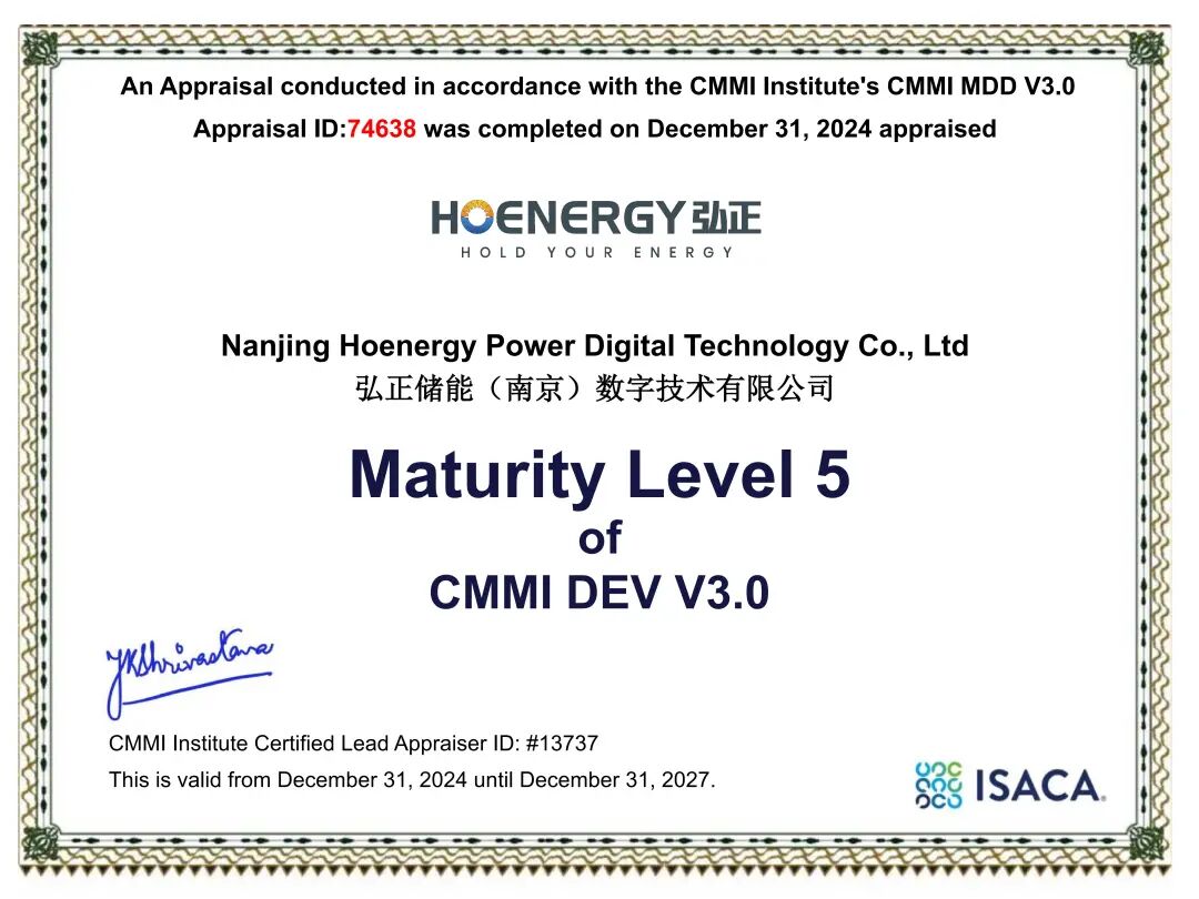 所有交付的底氣,源于弘正深耕數(shù)字化的長期積累。弘正儲能(南京)數(shù)字技術(shù)有限公司已正式通過全球軟件領(lǐng)域“天花板”認證——CMMI-DEV 3.0 5級,標(biāo)志著企業(yè)在軟件研發(fā)、服務(wù)交付的標(biāo)準(zhǔn)化、成熟度上達到國際先進水平。