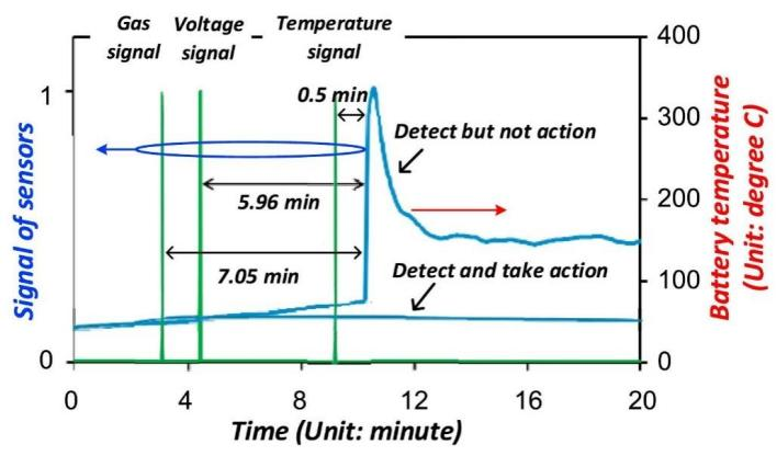 ↑ 基于氣體傳感器、電壓傳感器和溫度傳感器的熱失控監(jiān)測結果