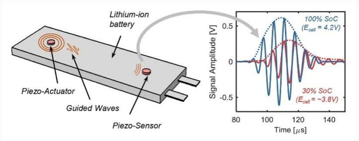 使用超聲探測電池內(nèi)部變化是一種新興的檢測技術。一般而言,該技術需要在電池表面安裝兩個壓電圓盤傳感器,分別用作激發(fā)器和接收器,前者產(chǎn)生超聲波信號,后者接收穿過電池內(nèi)部并反射回的信號。因為超聲波在固體和液體中衰減較低,但在氣體中衰減速度非常快,且對微小形變十分敏感,因此當電池發(fā)生膨脹,或內(nèi)部出現(xiàn)氣泡或裂縫時,能夠通過超聲波的變化迅速識別故障。但顯而易見,對復雜變化的超聲波信號的分析能力決定了該技術的檢測效果。超聲波可以在安全隱患階段和早期故障階段就探測到電池的異常,提前感知安全風險,因此是一種非常有效的安全風險預警技術。