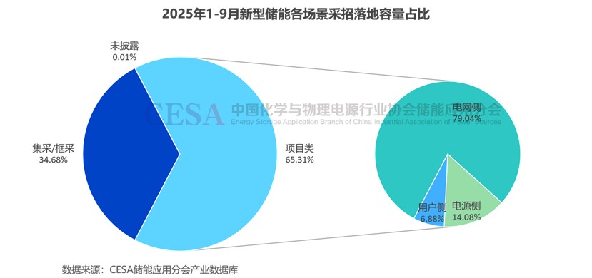 2025年1-9月,CESA儲能應(yīng)用分會共追蹤到1728個儲能采招落地項(xiàng)目,剔除同一項(xiàng)目對EPC和不同儲能系統(tǒng)設(shè)備多次采購的情況,對應(yīng)的實(shí)際儲能系統(tǒng)需求為89.2GW/321.2GWh,同比增長178%。其中,集采/框采落地規(guī)模為111.37 GWh,容量占比34.68%;項(xiàng)目類采招落地73.2GW/209.76GWh,容量占比65.31%。另有少量項(xiàng)目未披露采購形式。