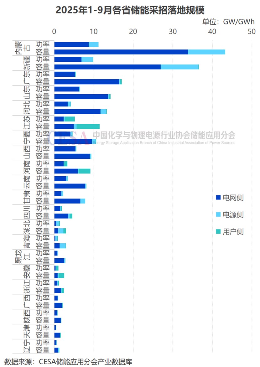 就省份來看,2025年1-9月,內(nèi)蒙古儲能采招落地項(xiàng)目規(guī)模躍居全國第一,達(dá)11.1GW/43.13GWh,占項(xiàng)目類采招落地總規(guī)模(73.2GW/209.76GWh)的15.17% (功率)/20.56%(容量),容量占比超過全國五分之一。伴隨新能源大基地和源網(wǎng)荷儲一體化項(xiàng)目推進(jìn),內(nèi)蒙古儲能市場潛力正加速釋放。