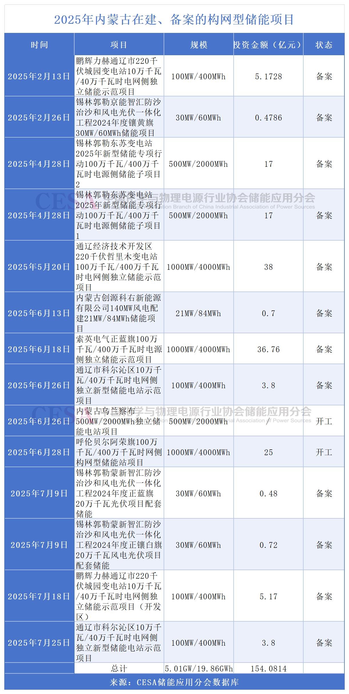 2024年7月印發(fā)的《內(nèi)蒙古自治區(qū)2024—2025年新型儲能發(fā)展專項行動方案》提出,到2025年建成投產(chǎn)14.5GW/65GWh新型儲能,其中構(gòu)網(wǎng)型儲能被列為重點發(fā)展方向。