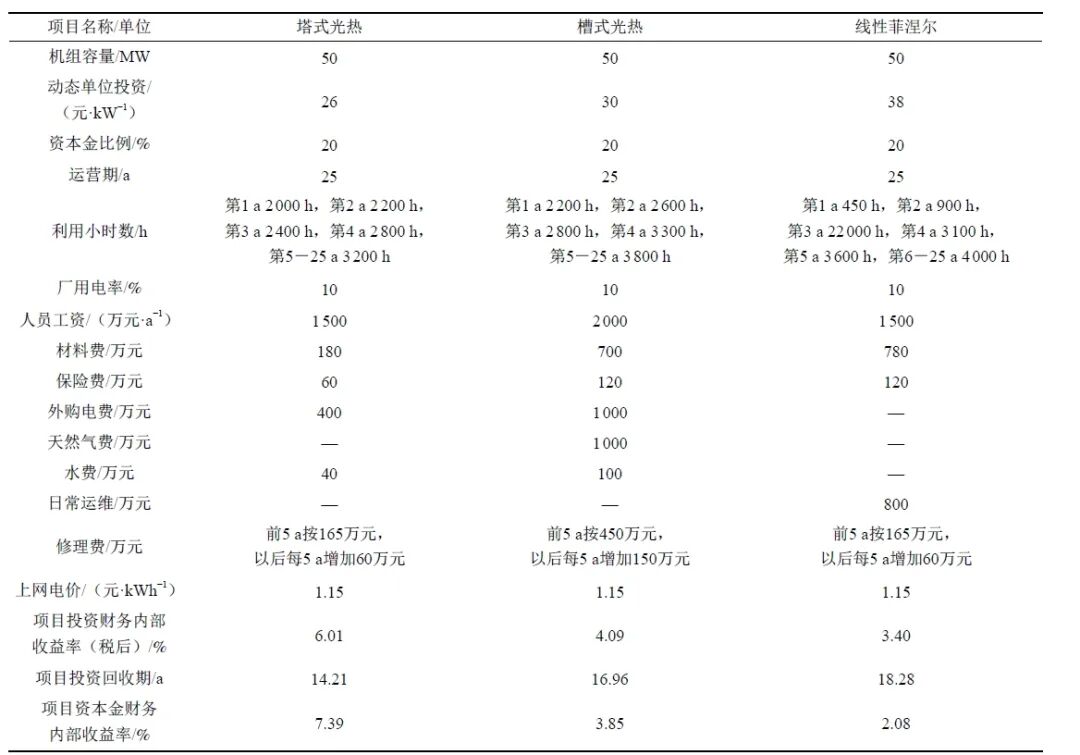 分析塔式、槽式和線性菲涅爾光熱電站的實(shí)際經(jīng)濟(jì)性,電價(jià)按照示范項(xiàng)目電價(jià)1.15元/千瓦時(shí),項(xiàng)目投資造價(jià)按照已投產(chǎn)項(xiàng)目實(shí)際運(yùn)行成本測(cè)算,容量按50吉瓦考慮。