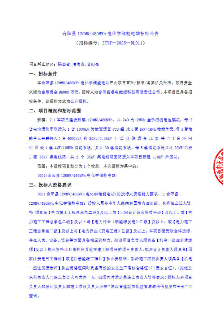 120MW/480MWh!陜西合陽(yáng)縣全釩液流電池儲(chǔ)能電站EPC招標(biāo)