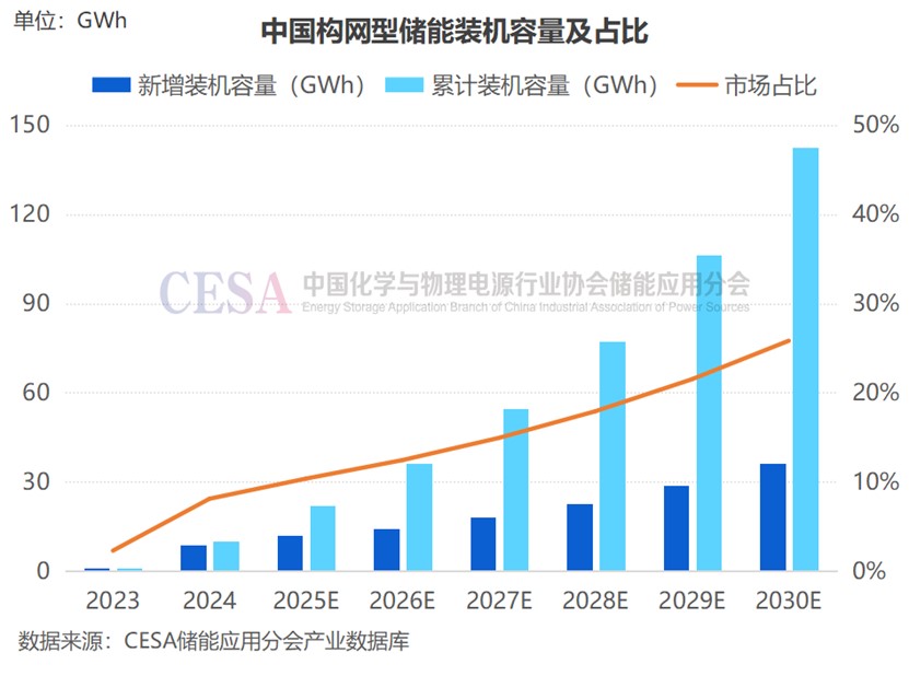據(jù)CESA儲能應(yīng)用分會預(yù)測,2025年中國構(gòu)網(wǎng)型儲能新增裝機將突破12GWh,同比增長34.8%。預(yù)計2030年中國構(gòu)網(wǎng)型儲能新增裝機將達到36GWh,市場占比有望突破25%,2024-2030年復(fù)合增長率達46%。預(yù)計到2030年,中國構(gòu)網(wǎng)型儲能累計裝機將超過140GWh。