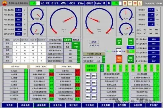 【儲(chǔ)能參數(shù)】監(jiān)控畫面, 查看儲(chǔ)能運(yùn)行的儀表監(jiān)控、功率比值、故障報(bào)警等詳細(xì)信息。