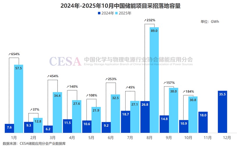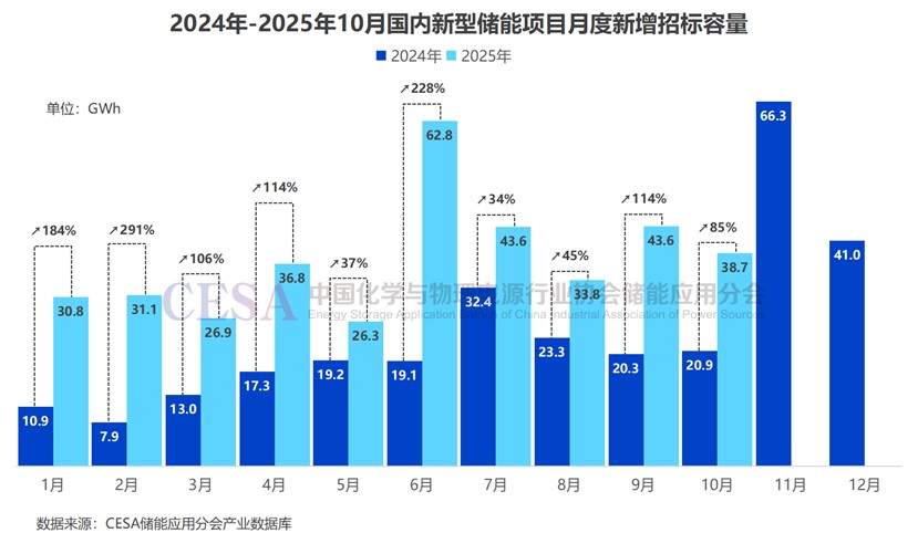 2025年10月,CESA儲(chǔ)能應(yīng)用分會(huì)產(chǎn)業(yè)數(shù)據(jù)庫(kù)共追蹤到315個(gè)儲(chǔ)能新增招標(biāo)項(xiàng)目,包括儲(chǔ)能EPC/PC、儲(chǔ)能系統(tǒng)、儲(chǔ)能電芯、BMS、PCS采購(gòu),以及設(shè)計(jì)、施工、安裝、改造、運(yùn)維、代工、容量租賃等各環(huán)節(jié),總規(guī)模達(dá)18.04GW/56.14GWh。其中,儲(chǔ)能EPC/PC(含直流側(cè)設(shè)備)、儲(chǔ)能系統(tǒng)和儲(chǔ)能電芯新增招標(biāo)項(xiàng)目共計(jì)12.7GW/38.7GWh,容量規(guī)模同比增長(zhǎng)85%。