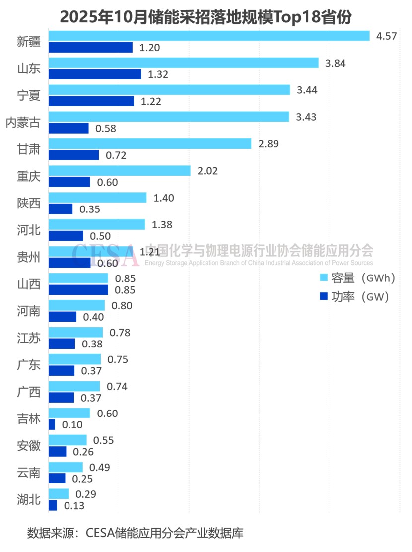 10月,儲(chǔ)能(含直流側(cè)設(shè)備)采招落地前四名省份分別是:新疆、山東、寧夏、內(nèi)蒙古,儲(chǔ)能(含直流側(cè)設(shè)備)采招落地容量均超3GWh。