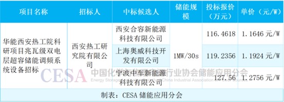 10月,華能西安熱工院科研項(xiàng)目兆瓦級(jí)雙電層超容儲(chǔ)能調(diào)頻系統(tǒng)設(shè)備采招項(xiàng)目開(kāi)標(biāo),該項(xiàng)目采購(gòu)1MW/30s雙電層超容直流預(yù)制艙以及設(shè)備配套冷卻系統(tǒng)、消防系統(tǒng)、視頻監(jiān)控系統(tǒng)、電氣一次及二次部件、電纜等附屬設(shè)備。西安合容新能源科技有限公司以116.4618萬(wàn)元的報(bào)價(jià)中標(biāo),中標(biāo)單價(jià)1.1646元/W。
