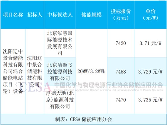 10月,沈陽(yáng)遼中景合儲(chǔ)能科技有限公司混合儲(chǔ)能電站項(xiàng)目(飛輪)設(shè)備采招落地,北京泓慧國(guó)際能源技術(shù)發(fā)展有限公司以7420萬(wàn)元的報(bào)價(jià)中標(biāo),中標(biāo)單價(jià)3.71元/W。