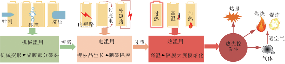 誘發(fā)鋰離子電池?zé)崾Э氐臑E用條件,如機(jī)械濫用、電濫用和熱濫用往往存在一定的關(guān)聯(lián),如下圖所示。