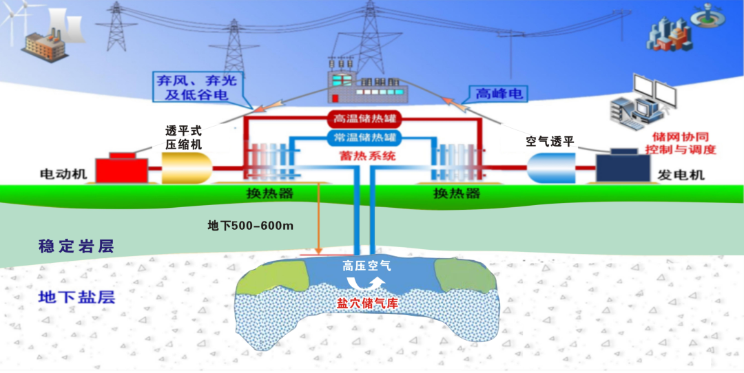 深夜,風機仍在旋轉(zhuǎn),富余電力驅(qū)動大型壓縮機,將空氣壓入地下千米鹽穴,壓力瞬間升至20兆帕,相當于海底200米的壓強;同時,壓縮產(chǎn)生的高熱被回收進儲熱罐,完成一次“電能—空氣內(nèi)能+熱能”的轉(zhuǎn)換。白天用電高峰,高壓空氣奔涌而出,經(jīng)儲熱系統(tǒng)再熱后推動膨脹機,帶動發(fā)電機向電網(wǎng)饋電。整個循環(huán)只需八分鐘便可從冷態(tài)升至滿負荷,響應(yīng)速度媲美燃氣調(diào)峰機組,卻幾乎零碳排放。