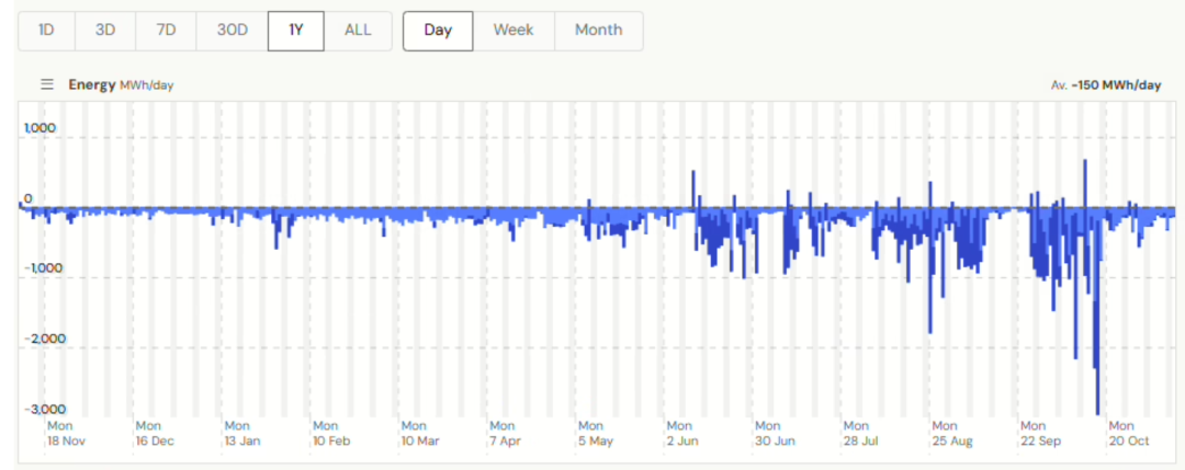 當(dāng)前運(yùn)行:10 月中旬完成滿出力測試后,站點(diǎn)能量活動(dòng)明顯回落;10 月 10 日實(shí)現(xiàn)首次整站完全放電,10 月 17 日充放電合計(jì)峰值 2,774 MWh。目前以約 350 MW 規(guī)模部分運(yùn)行(推測依賴剩余完好的主變)。