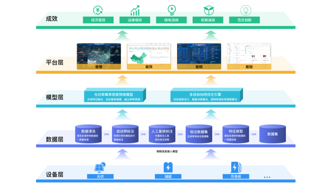 三是開發(fā)AI驅(qū)動(dòng)的數(shù)據(jù)建模與優(yōu)化技術(shù)?;谔鞓衅脚_(tái)調(diào)用光儲(chǔ)充一體化綜合能源高質(zhì)量數(shù)據(jù)集,融合多源特征和氣象特征與光功率概率密度函數(shù)的映射關(guān)系,開發(fā)光功率概率密度預(yù)測(cè)模型,實(shí)現(xiàn)光伏發(fā)電92%的預(yù)測(cè)準(zhǔn)確率,顯著優(yōu)于行業(yè)平均水平。同時(shí),構(gòu)建了多目標(biāo)協(xié)同優(yōu)化引擎,實(shí)現(xiàn)綜合能源效率提升10%。