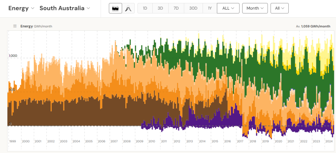 澳大利亞各州發(fā)電出力組合差異較大,其中南澳州已實(shí)現(xiàn)極高比例的風(fēng)光發(fā)電出力組合供電,風(fēng)光不可用時(shí)的靈活性需求則由聯(lián)絡(luò)線(xiàn)以及多種燃?xì)鈾C(jī)組滿(mǎn)足。與南澳州相鄰的維多利亞州則仍然保留了較高比例的褐煤發(fā)電機(jī)組,系統(tǒng)所需的剩余靈活性則來(lái)自聯(lián)絡(luò)線(xiàn)、水電、小比例天然氣機(jī)組的組合。