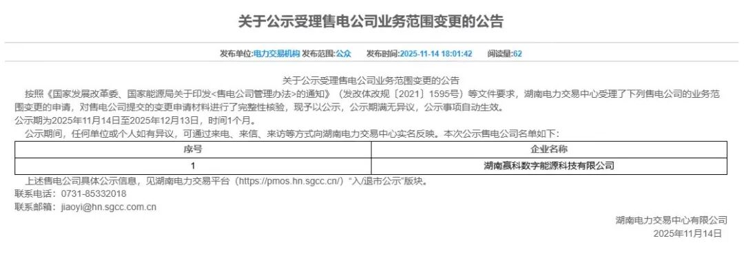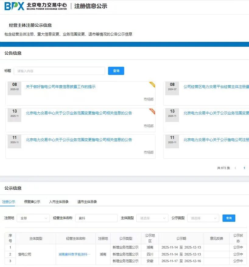 中國儲能網(wǎng)訊:根據(jù)北京電力交易中心最新公示信息,贏科數(shù)能(湖南贏科數(shù)字能源科技有限公司)已完成在四川、安徽兩省的業(yè)務范圍變更申請,具備兩省的售電資質。