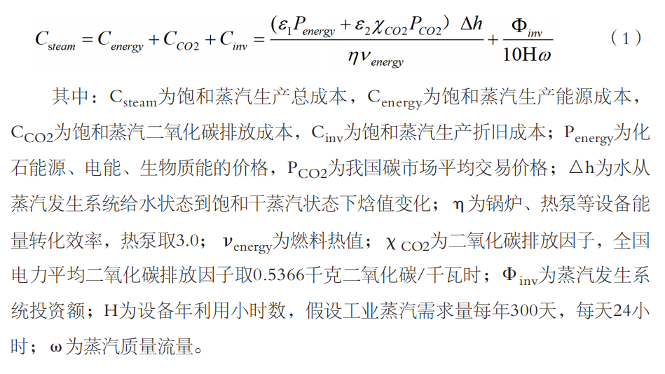 根據(jù)我國城市供熱價格管理相關規(guī)定,供熱成本是指供熱過程中發(fā)生的燃料費、電費、水費、資產折舊費、修理費、工資以及其他應計入供熱成本的直接費用。由于本文側重分析不同技術路徑之間的成本對比,為簡化分析,供熱成本計算時只考慮涉及能源成本和投資強度的成本項。同時,考慮到不同能源碳排放強度不同,碳排放成本作為蒸汽成本之一。