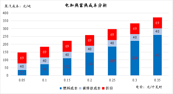 電加熱蓄熱可以作為天然氣供熱的一種替代或互補方式。電供熱成本受電價影響顯著,電加熱蓄熱充分利用低谷時段電價,只有當平均電價低于0.02元/千瓦時時,蒸汽成本與標準煤價格為1000元/噸時相當,當平均電價低于0.25元/千瓦時時,蒸汽成本相比天然氣(價格3.5元/標準立方米)供熱更低。