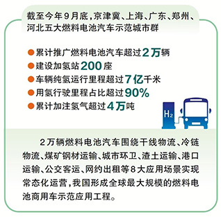 氫能在交通領(lǐng)域的應(yīng)用是氫能大規(guī)模普及使用的突破口。2020年9月,財政部、工業(yè)和信息化部、科技部、國家發(fā)展改革委、國家能源局等五部門聯(lián)合發(fā)布《關(guān)于開展燃料電池汽車示范應(yīng)用的通知》,明確燃料電池汽車示范城市群要完善燃料電池汽車和氫能相關(guān)技術(shù)指標(biāo)、測試標(biāo)準(zhǔn),為燃料電池汽車示范應(yīng)用提供經(jīng)濟(jì)、安全穩(wěn)定的氫源保障,探索發(fā)展綠氫,有效降低車用氫能成本等。2021年8月,北京、上海和廣東報送的城市群啟動實(shí)施燃料電池汽車示范應(yīng)用。2021年12月,鄭州和河北燃料電池汽車示范城市群相繼獲批,全國形成了“3+2”燃料電池汽車示范格局,推動燃料電池汽車示范應(yīng)用發(fā)展。