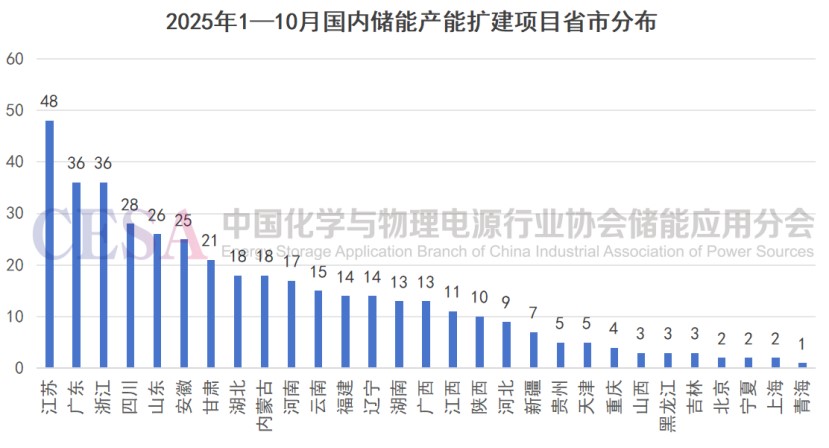 如果將視角下沉到省級層面,江蘇省以48個項目遙遙領(lǐng)先全國,蘇州、無錫等制造業(yè)重鎮(zhèn)無疑是其項目的主要承載地。廣東和浙江則以36個項目并列第二。廣東的項目多集中在深圳、惠州等珠三角城市,重點在于鋰電池產(chǎn)業(yè)鏈的進一步延伸;而浙江的項目則主要分布在杭州、寧波,充分依托其活躍的民營經(jīng)濟來推動儲能技術(shù)的商業(yè)化應用。