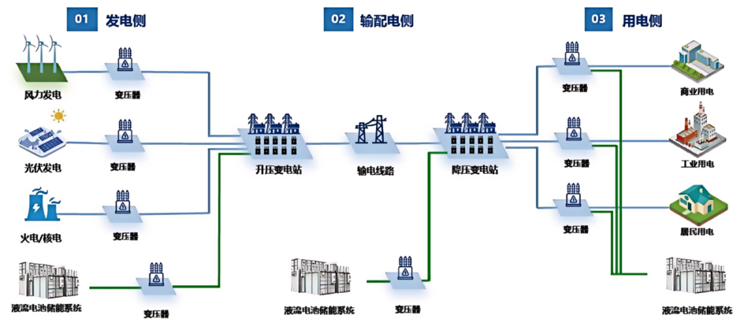 圖1.1為全釩液流電池工作原理示意圖,全釩液流電池通過電解液循環(huán)系統(tǒng),使釩離子在電堆內(nèi)發(fā)生價態(tài)變化,通過電極反應(yīng)和離子膜選擇性傳導(dǎo),完成能量的儲存與釋放。圖1.2為全釩液流電池儲能系統(tǒng)覆蓋發(fā)電、輸配電、用電側(cè)的示意圖,助力電網(wǎng)高效穩(wěn)定運(yùn)行。
