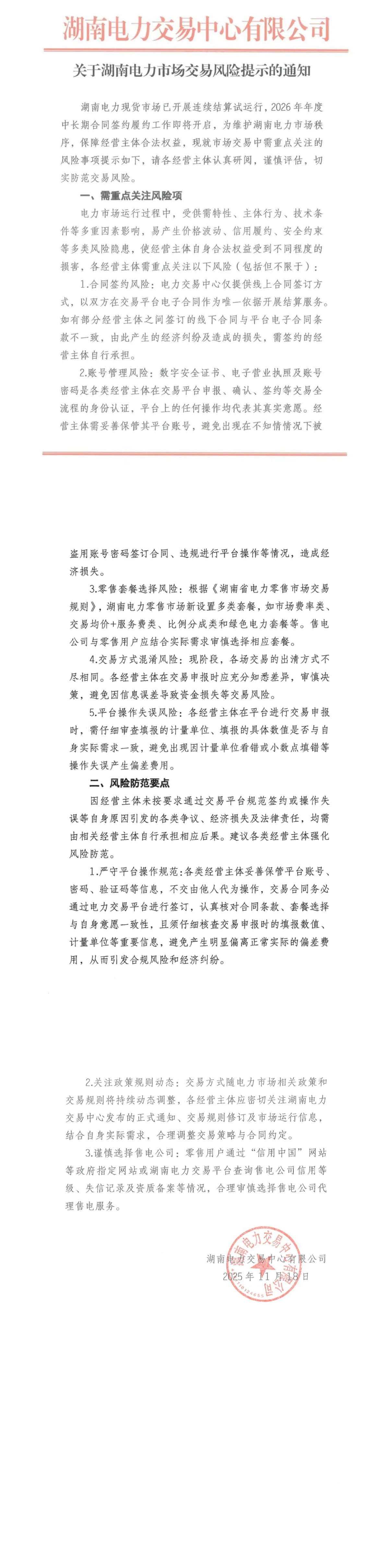 中國儲能網(wǎng)訊:湖南電力現(xiàn)貨市場已開展連續(xù)結(jié)算試運(yùn)行,2026年年度中長期合同簽約履約工作即將開啟,為維護(hù)湖南電力市場秩序,保障經(jīng)營主體合法權(quán)益,現(xiàn)就市場交易中需重點(diǎn)關(guān)注的風(fēng)險事項提示如下,請各經(jīng)菅主體認(rèn)真研閱,謹(jǐn)慎評估,切實防范交易風(fēng)險。
