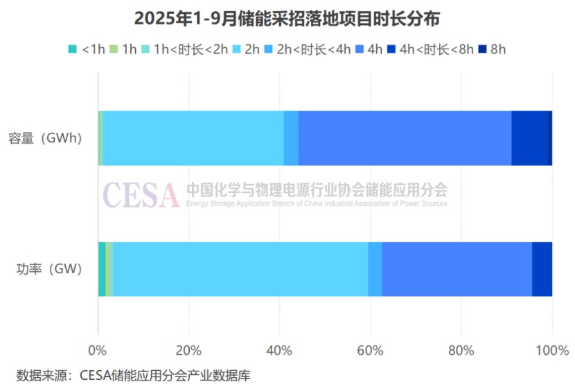 據(jù)CESA儲(chǔ)能應(yīng)用分會(huì)產(chǎn)業(yè)數(shù)據(jù)庫(kù)不完全統(tǒng)計(jì),2025年1-9月,國(guó)內(nèi)73.2GW/209.76GWh采招落地的儲(chǔ)能項(xiàng)目中,明確時(shí)長(zhǎng)的儲(chǔ)能項(xiàng)目為71.9GW/202.4GWh。