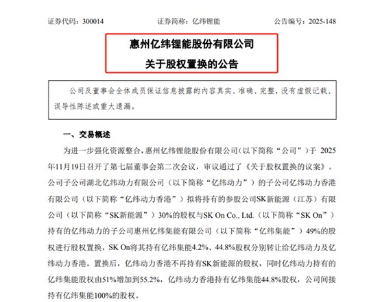 然而真正的棋局,遠比產(chǎn)品層面的合縱連橫更為宏大。2025年11月20日,一紙股權(quán)置換公告將億緯鋰能與韓國電池巨頭SK On的“跨國聯(lián)姻”推向了尾聲。