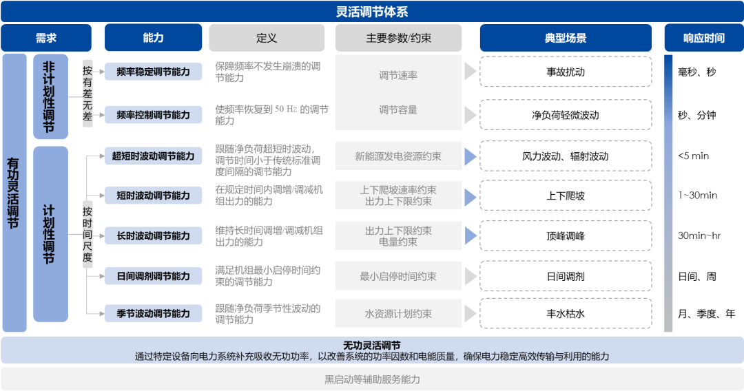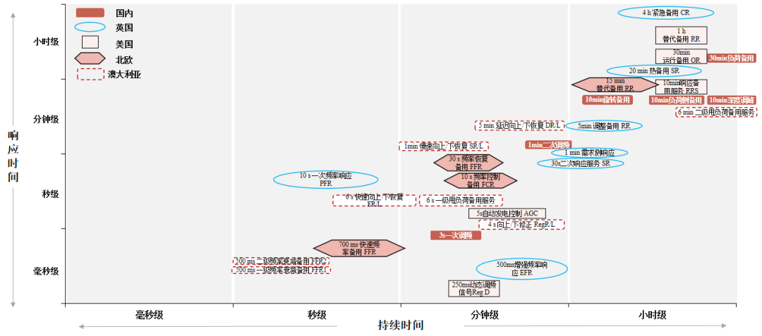 從國際經驗看,歐美等國家的靈活調節(jié)體系更強調非計劃性調節(jié),在頻率控制調節(jié)能力、頻率恢復調節(jié)能力上,有更細致的分級與更開放的市場。同時,近年來持續(xù)細化顆粒度,新增了毫秒級響應時間服務(美國的RegD、英國的EFR、北歐的FFR、澳大利亞的FFR1)。當前,國內進入輔助服務市場交易的產品以調峰輔助服務居多,國外成熟電力市場體系中均未設置調峰輔助服務,相關能力的價值通過在現(xiàn)貨主能量市場中解決;國內外在超短時波動調節(jié)能力上,都存在較大空缺。隨著接入電網(wǎng)的可再生能源及電力電子裝備的比例日益增大,在超短時的時間尺度上的靈活調節(jié)充裕度或將受到挑戰(zhàn)。各國靈活調節(jié)能力產品的性能要求如下圖所示。