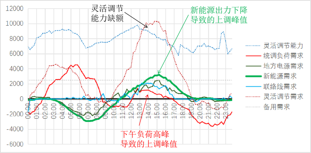 隨著新能源滲透率大幅提高,新能源出力的急劇上升會導致系統(tǒng)急需減小出力,產生下調需求峰值;而新能源出力的急劇下降則會導致系統(tǒng)急需加大出力,產生上調需求峰值。因此,對于光伏裝機容量較大的區(qū)域,新能源波動產生的調節(jié)需求峰值易與系統(tǒng)負荷曲線產生的調節(jié)峰值形成“峰上疊峰”。