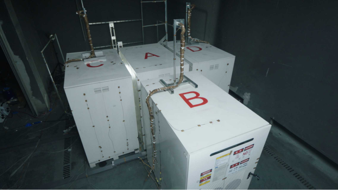 測試的嚴(yán)苛還表現(xiàn)在:①采用UL9540A:2025中定義的開門燃燒方案,主動(dòng)提供最大供氧量;②所有PACK均充至滿電狀態(tài)100%SOC;③關(guān)閉所有主被動(dòng)消防系統(tǒng),讓儲(chǔ)能系統(tǒng)在能量滿格、充分燃燒的條件下,完全依靠自身設(shè)計(jì)"硬抗"烈火考驗(yàn)。