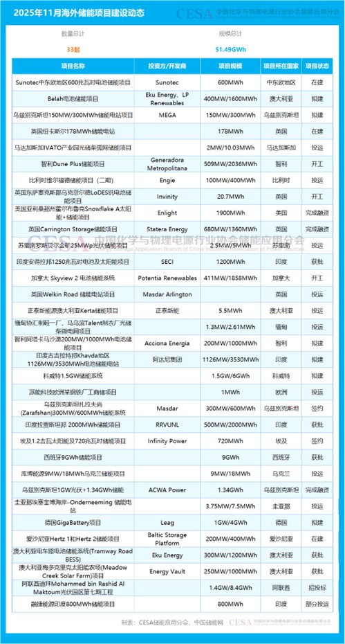 中國儲能網(wǎng)訊:2025年11月,CESA儲能應(yīng)用分會產(chǎn)業(yè)數(shù)據(jù)庫追蹤到33起海外儲能項目建設(shè)動態(tài)事件,總規(guī)模為51.49GWh,涉及Sunotec、Eku Energy、LP Renewables、MEGA、Generadora Metropolitana、Engie、Enlight、Statera Energy、SECI、Potentia Renewables、Acciona Energía、Masdar、RRVUNL、Infinity Power、ACWA Power、 Leag、Baltic Storage Platform、Eku Energy、Energy Vault等全球能源投資方/開發(fā)商,建設(shè)地點位于智利、英國、印度、西班牙、烏茲別克斯坦、美國、加拿大、德國、澳大利亞、愛沙尼亞、埃及、阿聯(lián)酋等全球20多個國家。