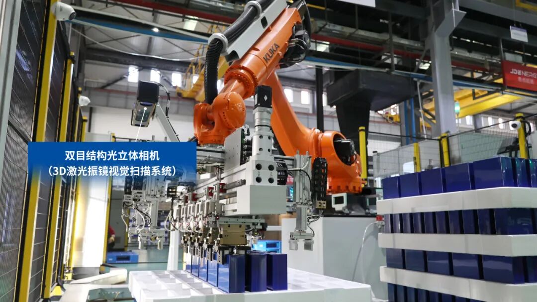 模組產(chǎn)線的核心挑戰(zhàn)之一在于電芯上料的精度、效率與兼容性。產(chǎn)線升級后,奇點(diǎn)能源為負(fù)責(zé)電芯上料的機(jī)械臂配備了一副“智慧眼鏡”——雙目結(jié)構(gòu)光立體相機(jī)(3D激光振鏡視覺掃描系統(tǒng))。