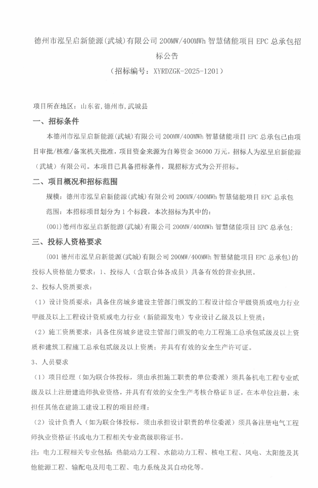 200MW/400MWh!山東德州儲(chǔ)能項(xiàng)目EPC招標(biāo)